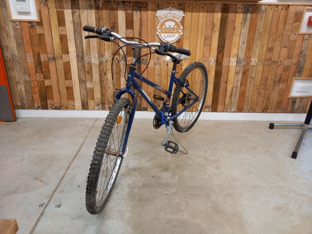 VTT bleu révisé, selle blanche.